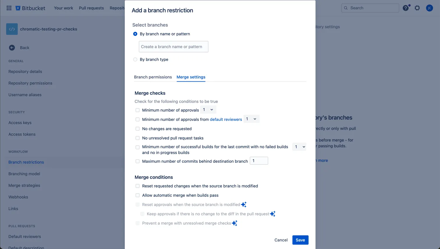 With BitBucket, some merge checks are already in place by default for pull requests. You can adjust that behavior with a custom configuration. Check out the following links for more information: